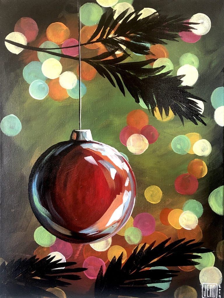 Join us for creative evening! In this hands-on class, you will be painting a lone ornament framed by glowing lights, set against rich hues of red, green, white and warm orange. This is a guided session with our art instructor.