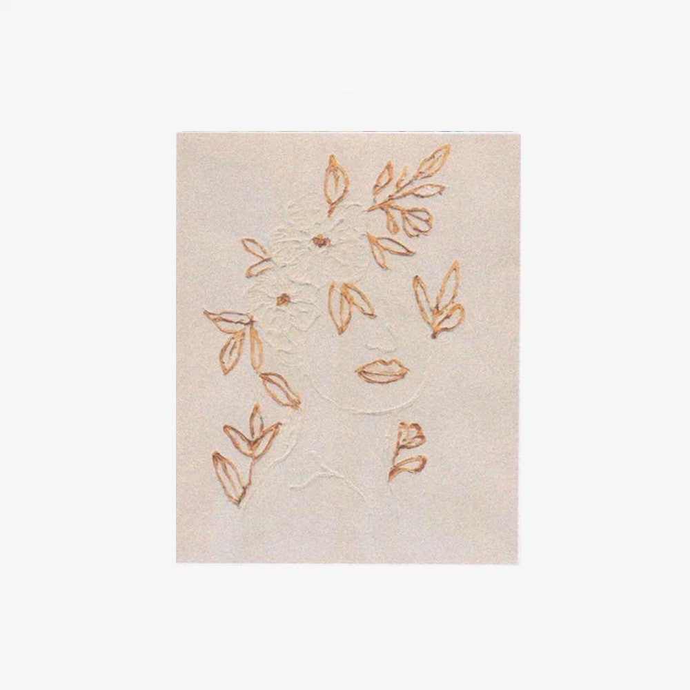 Delicate white and gold floral lines shape a serene feminine face, blending elegance and minimalism in this textured, ethereal piece.