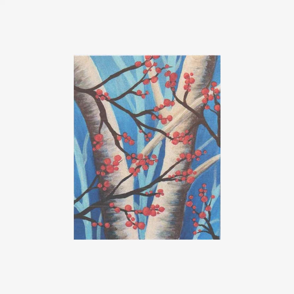 Crisp birch trees stretch upward against a cool blue backdrop, while red winter berries add a bold, festive contrast in this vibrant forest scene.